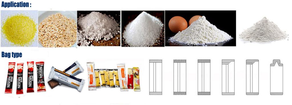 دا ماشین په عمده توګه د پاؤلو محصولاتو بسته کولو لپاره کارول کیږي: لکه د شيدو پوډر، د شیدې د چای پاؤډر، د قوه کڅوړه، مصالحې، د خاورې پاؤر، پروټین پاؤډ، مرمۍ، د هګۍ پوډر، کیمیاوي او د طبی پاؤر محصولات.